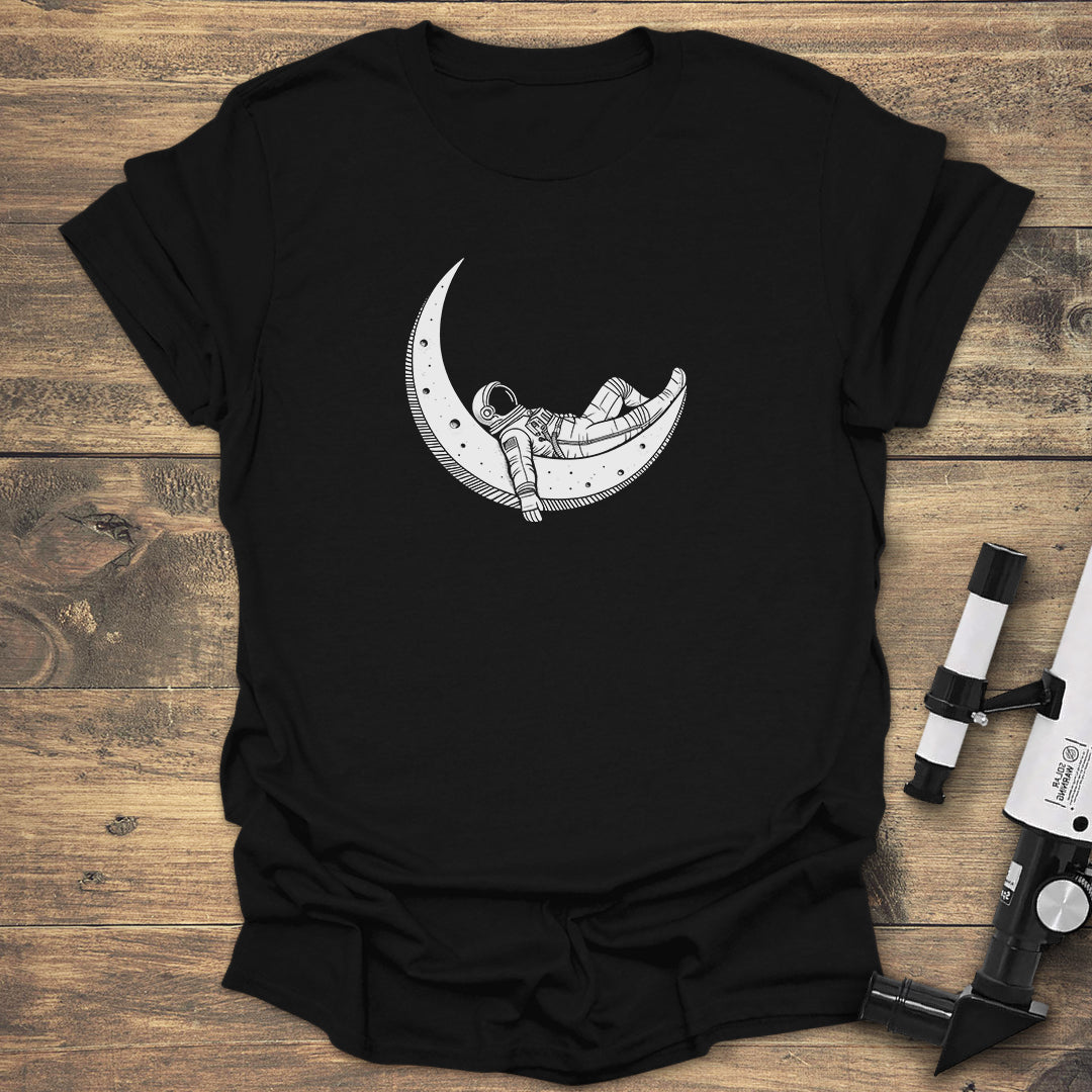 Drift into a cosmic daydream with this enchanting T-shirt featuring an astronaut comfortably lounging on a crescent moon. This serene graphic captures the peace of the night sky, perfect for stargazers, space dreamers, and anyone who feels at home among the stars.