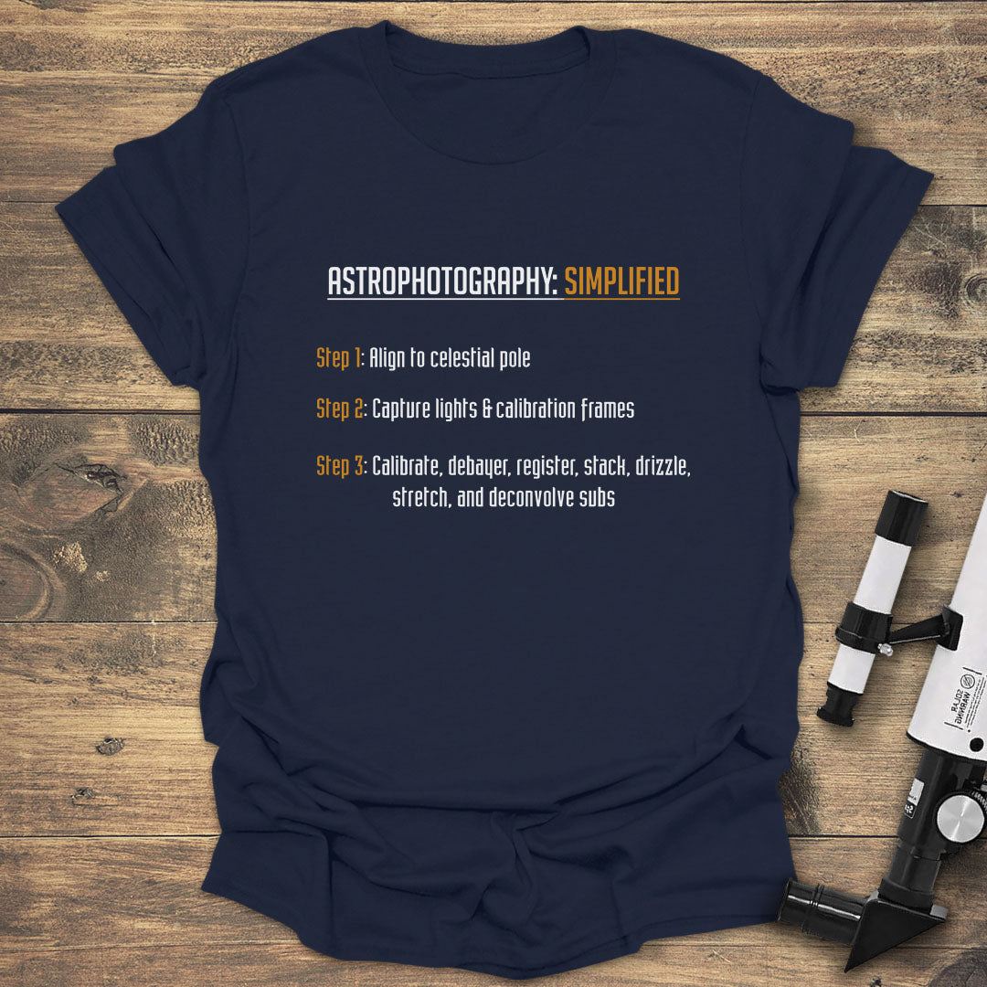 Get a laugh from fellow deep-sky enthusiasts with this "ASTROPHOTOGRAPHY: SIMPLIFIED" T-shirt! This humorous design playfully outlines the complex steps of astrophotography, from "Step 1" to "Stack, drizzle, stretch, deconvolve and debayer subs." Perfect for astrophotographers, astronomers, and anyone who appreciates the intricate art of capturing the cosmos.
