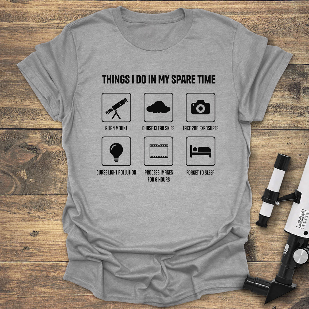 Capture the life of an astrophotographer with this relatable "Things I Do In My Spare Time" T-shirt. It features icons for aligning mounts, chasing clear skies, taking exposures, cursing light pollution, processing images, and forgetting to sleep! Perfect for dedicated night sky photographers.