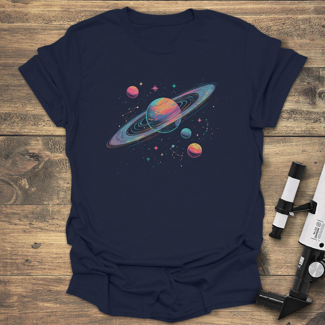 Explore the universe with the Cosmic Planet T-Shirt, featuring a vibrant Saturn and planetary design. Perfect for astronomy enthusiasts.