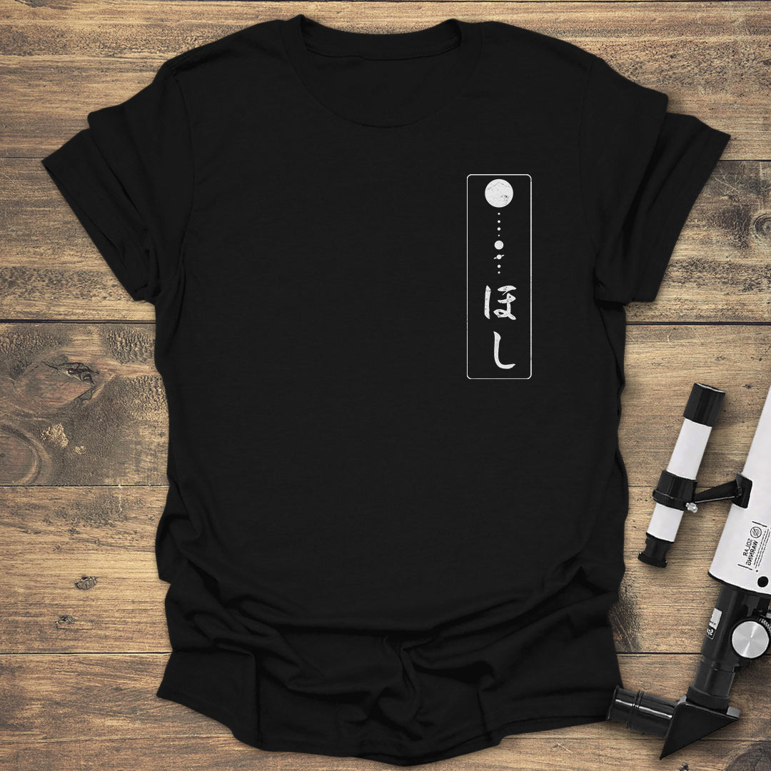 Embrace celestial beauty with this unique "Hoshi" T-shirt! Featuring a minimalist silhouette of the solar system above the Japanese characters for "star" (ほし), and complemented by a serene dot graphic that evokes a string of lights or distant stars, it's an elegant design for those who appreciate both astronomy and Japanese aesthetics.