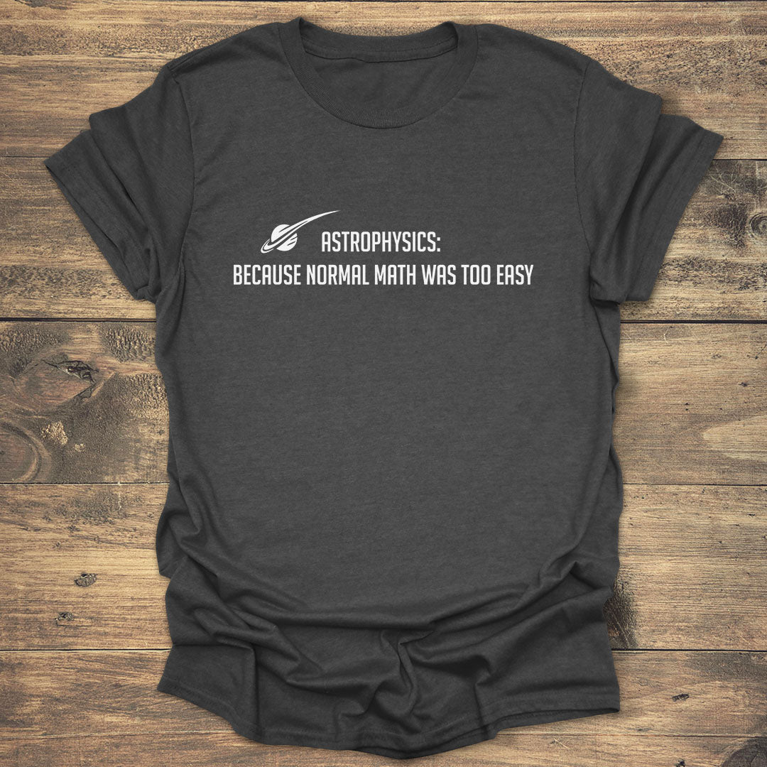 For the smart and dedicated scientist in your life. This witty T-shirt features a bold statement: "ASTROPHYSICS: BECAUSE NORMAL MATH WAS TOO EASY". It's a humorous and relatable nod to the fact that astrophysics is a challenging field that requires an immense amount of intelligence and dedication. It's the perfect conversation starter at any science gathering.