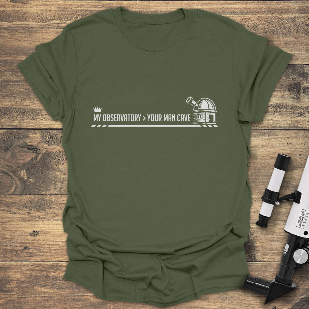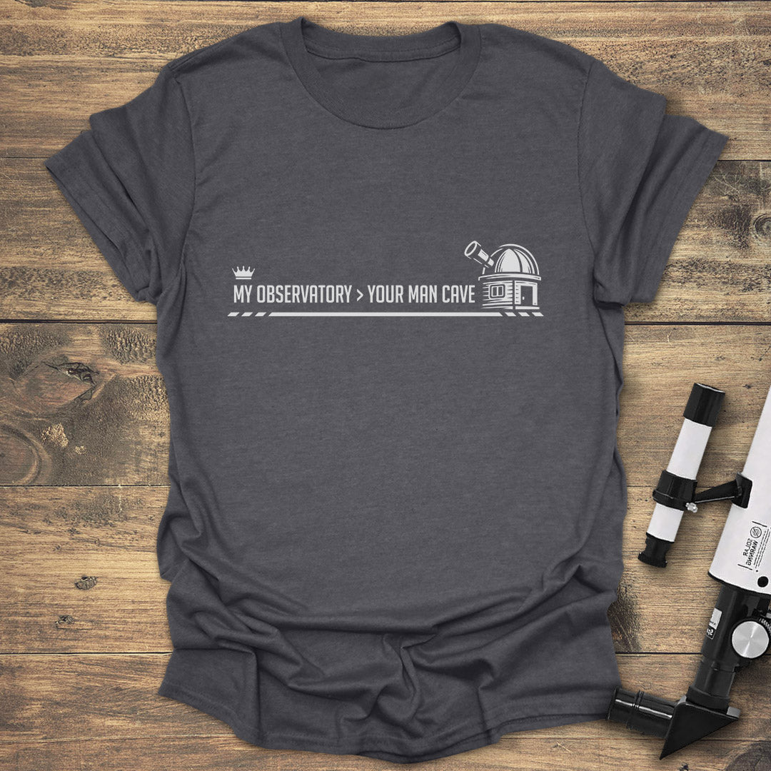 Declare your ultimate sanctuary with this "MY OBSERVATORY > YOUR MAN CAVE" T-shirt! Featuring a playful comparison between an observatory and a typical man cave, this design is perfect for dedicated astronomers and stargazers who know where the real action (and best views) can be found.