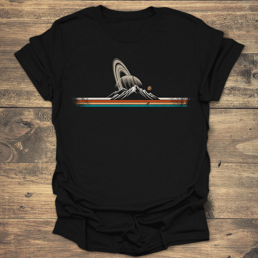 Discover a surreal celestial landscape with this unique T-shirt! Featuring majestic mountains bathed in a distant sun, crowned by the iconic rings of Saturn, this design blends earthly grandeur with cosmic wonder. The subtle retro stripe accents add a touch of vintage cool, making it perfect for stargazers, hikers, and anyone who dreams of alien vistas and astronomical beauty.
