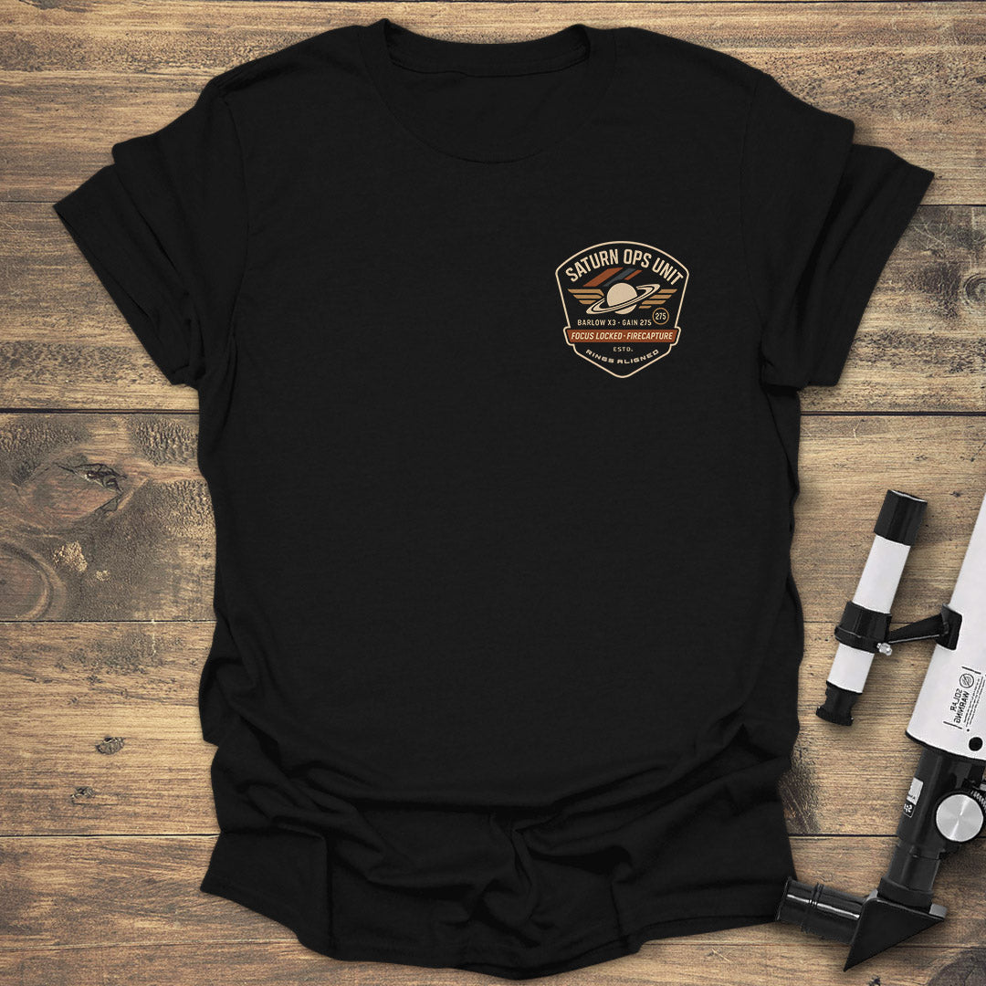 Show your dedication to capturing the cosmos with the "Saturn Ops Unit" T-shirt. This detailed front print features a vintage-style graphic of Saturn with technical specs like "BARLOW X3" and "GAIN 275." The design proudly declares "FOCUS LOCKED - FIRECAPTURE" and "RINGS ALIGNED," celebrating the meticulous process of planetary imaging. It’s the perfect apparel for the astrophotographer who is focused on getting the perfect shot of our solar system's ringed jewel.