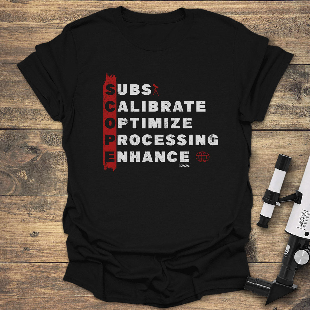 For the dedicated astrophotographer, this "SCOPE" T-shirt brilliantly outlines the key steps to transforming raw data into stunning cosmic images: SUBS, CALIBRATE, OPTIMIZE, PROCESSING, ENHANCE! Featuring subtle telescope and globe graphics, it's a perfect tribute to the intricate art and science of deep-sky imaging.