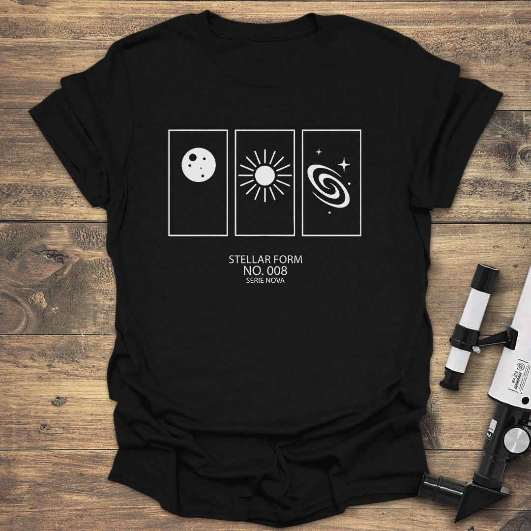 This T-shirt is a clean, artistic tribute to the cosmos. The design features three minimalist panels showcasing a moon, a sun-like star, and a spiral galaxy, all under the title "Stellar Form No. 008." Part of the "Serie Nova" collection, this shirt is perfect for anyone who appreciates the elegant and beautiful forms of the universe.