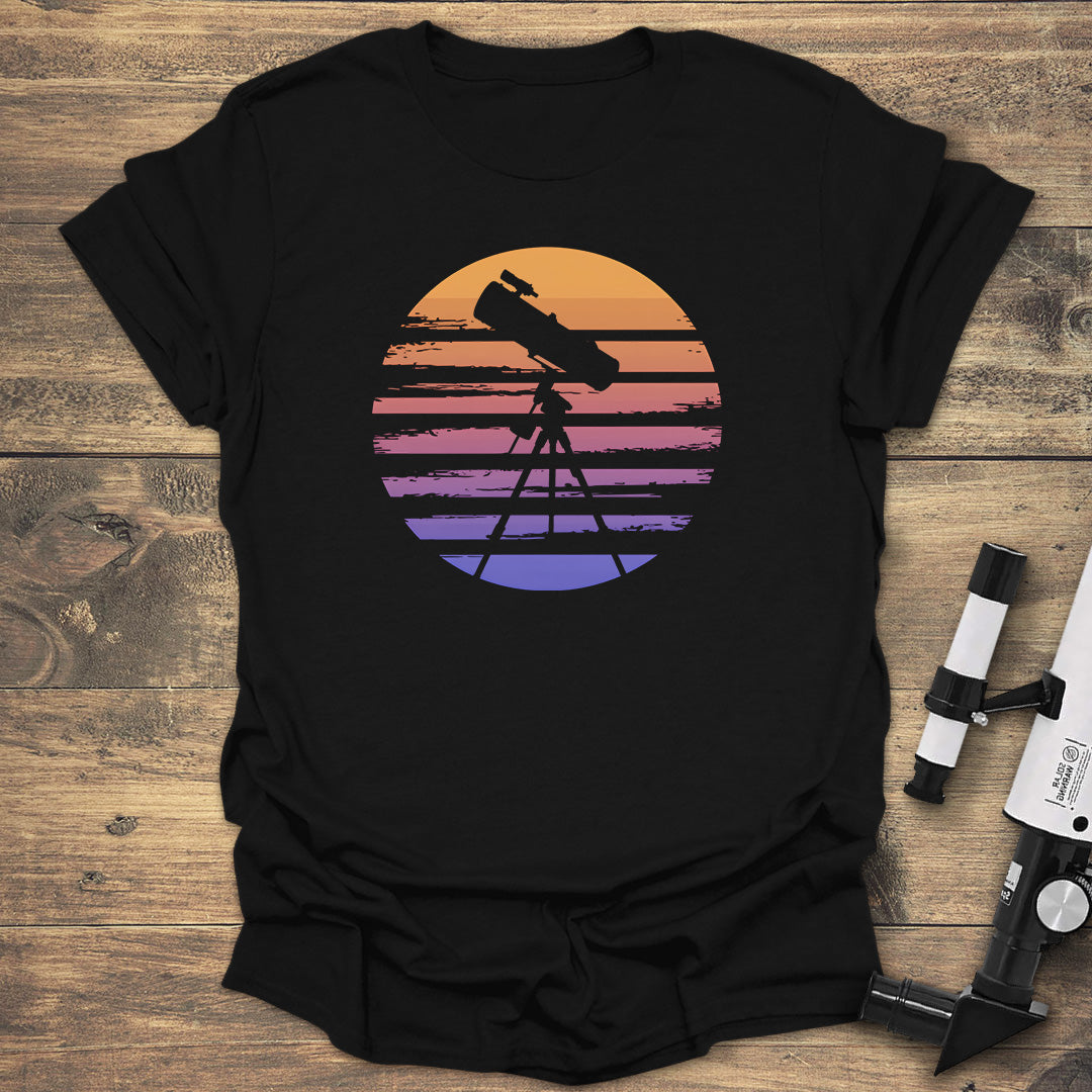Embrace the beauty of twilight and the cosmos with this stunning graphic tee featuring a telescope silhouetted against a vibrant, retro-striped sunset. This artistic design captures the magic of evening observations, perfect for astronomers, stargazers, and anyone who finds peace and wonder looking up at the sky.