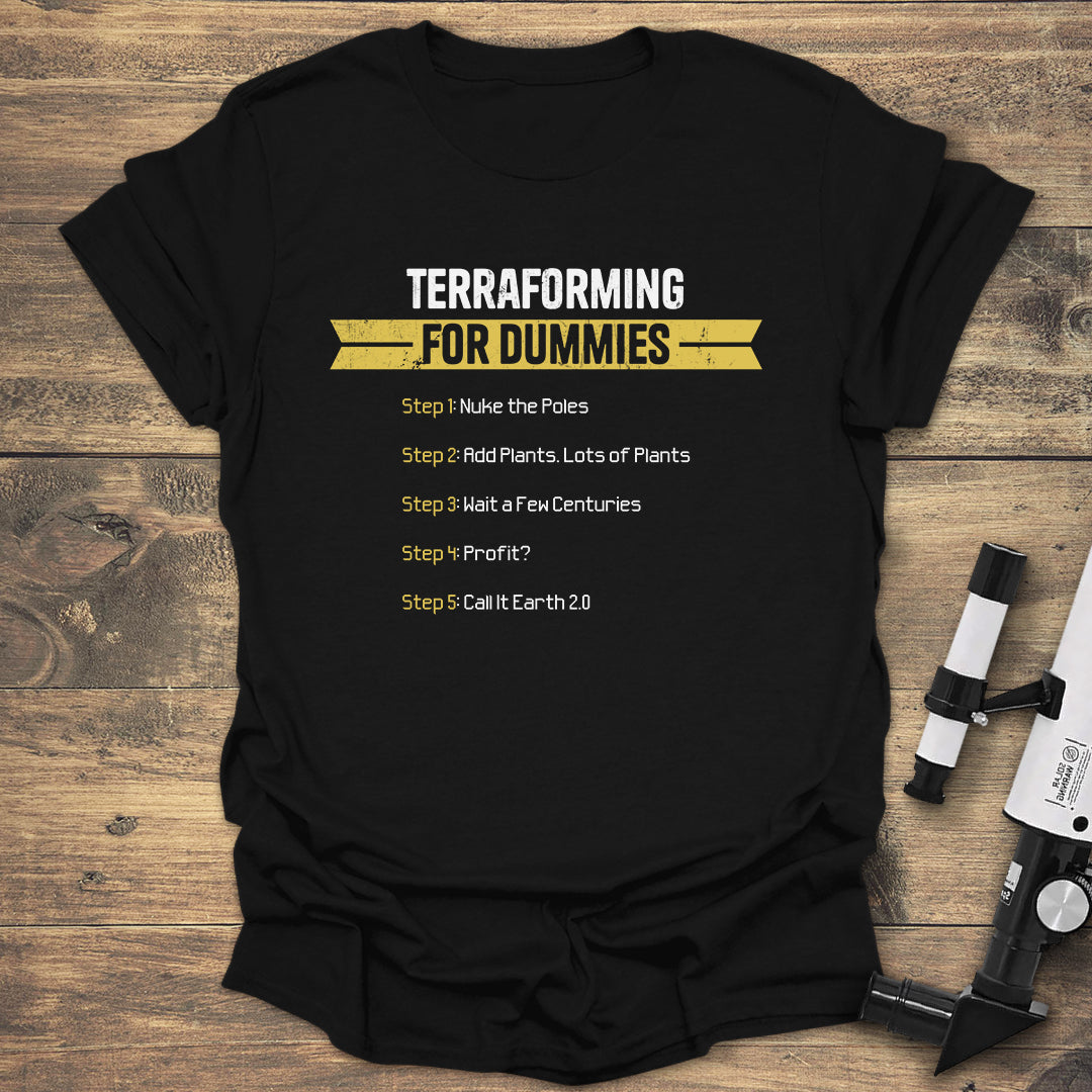 Thinking of starting your own planet? This humorous "TERRAFORMING FOR DUMMIES" T-shirt lays out the surprisingly simple (and satirical) steps, from "Nuke the Poles" to "Call It Earth 2.0"! Perfect for sci-fi enthusiasts, aspiring planetary engineers, and anyone who enjoys a good laugh about future colonization.