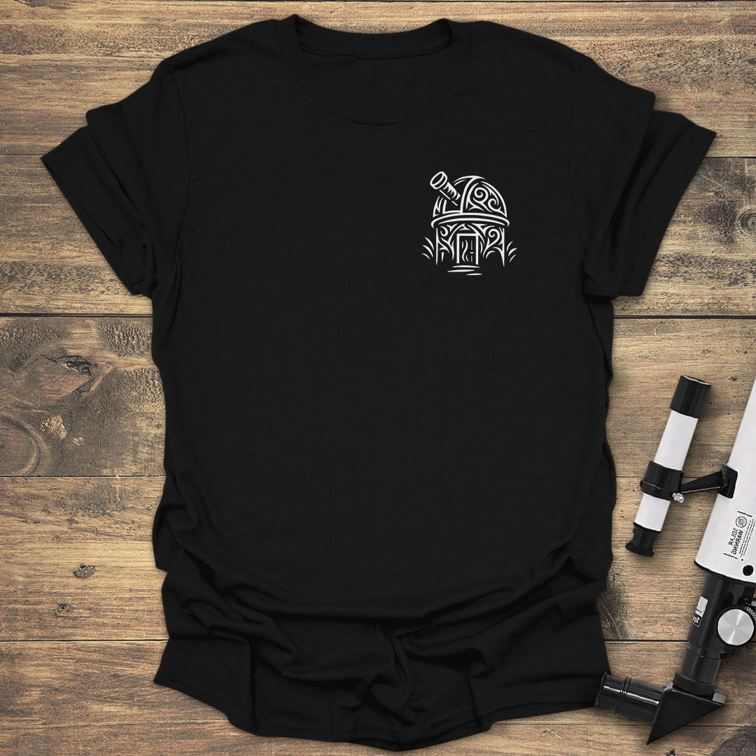 This T-shirt is for the dedicated astronomer who has, or dreams of having, a personal backyard observatory. The unique design features a stylized telescope dome in a detailed, tribal-inspired art style, blending the technical precision of the hobby with a classic, artistic feel. It's a perfect way to show your dedication to the cosmos in a subtle and elegant way.