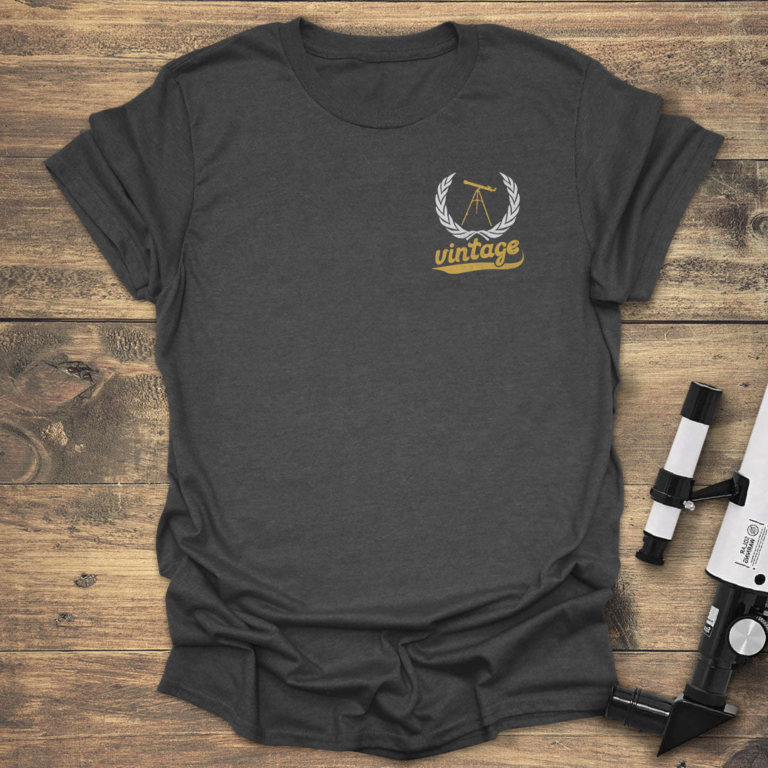 A subtle nod to the classic art of stargazing. This design features a vintage telescope silhouette framed by a laurel wreath, with the word "vintage" in a retro script. It’s perfect for the astronomer who appreciates both the history of the hobby and a clean, classic aesthetic. This understated design is great for everyday wear, whether you're at a star party or just running errands.